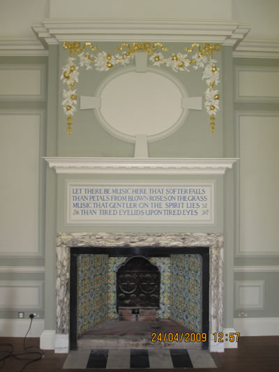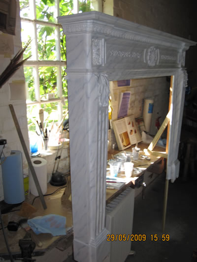 The example here shows how we are able to finish mouldings, walls and furniture to match existing stone finishes, this example being carrera marbel.