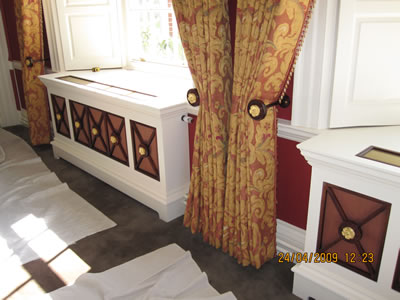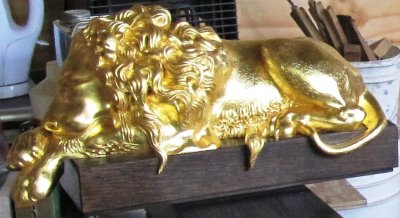 The art of gilding is an ancient technique using the same materials and methods today as hundreds of years ago. First the structure is built and carved, then gesso, which is made from animal skin glue and whiting(ground chalk), is gradually applied, producing a hard, evenly smooth layer. Red, black, blue, or yellow clay or bole is painted on the smoothed gesso surface. 22kt gold leaf is then applied with a gilder’s tip, a thin, flat brush. The gold may then be burnished with an agate stone, or rubbed and antiqued, depending on the desired finish.